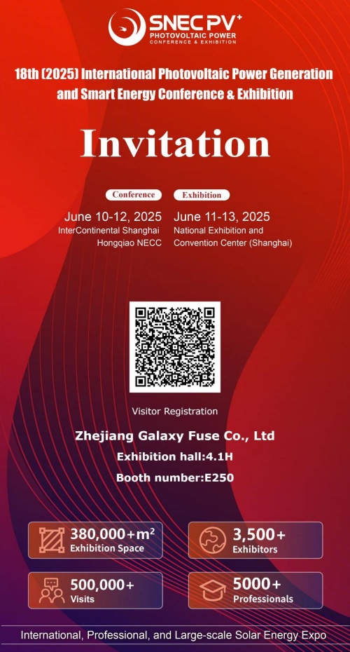 Sleutelwoorden:SNEC PV+, fotovoltaïsche tentoonstelling, nieuwe energietentoonstelling, Shanghai Solar Exhibition, Exhibition Preview, Booth Information,Zhejiang Galaxy Fuse Co. Ltd.,Samensmelten, PV -zekering, Smart Energy, Exhibition Invitation, 2025 Exhibition, Shanghai Exhibition.
